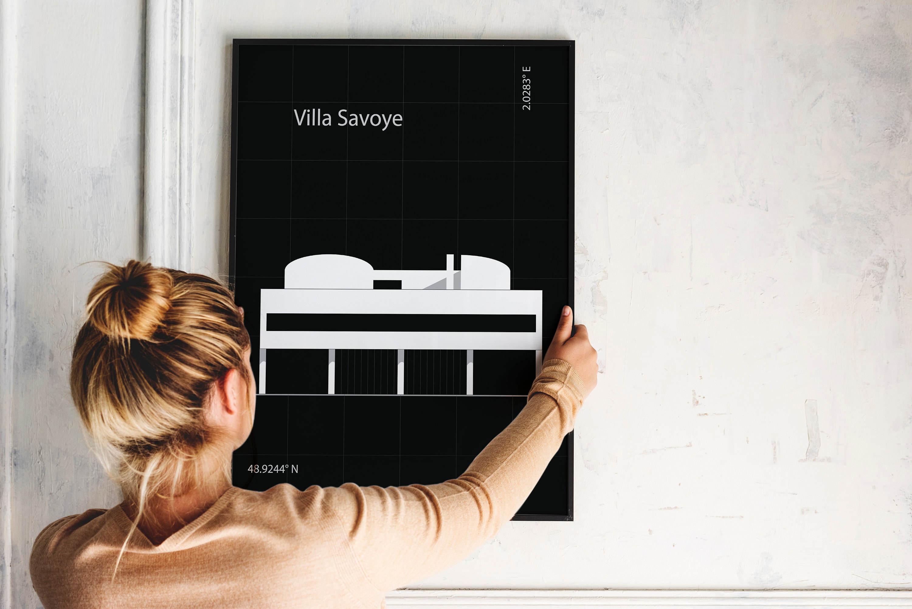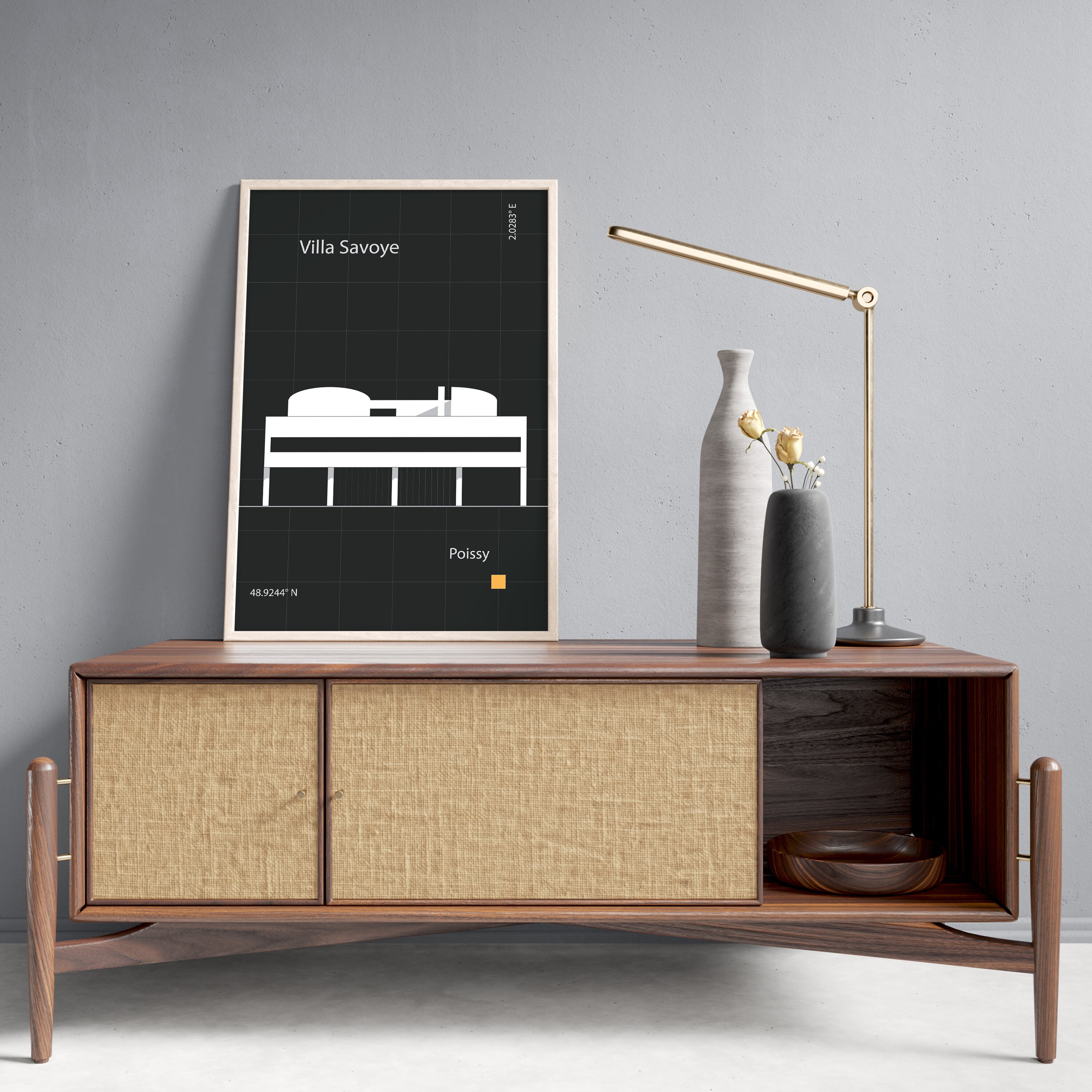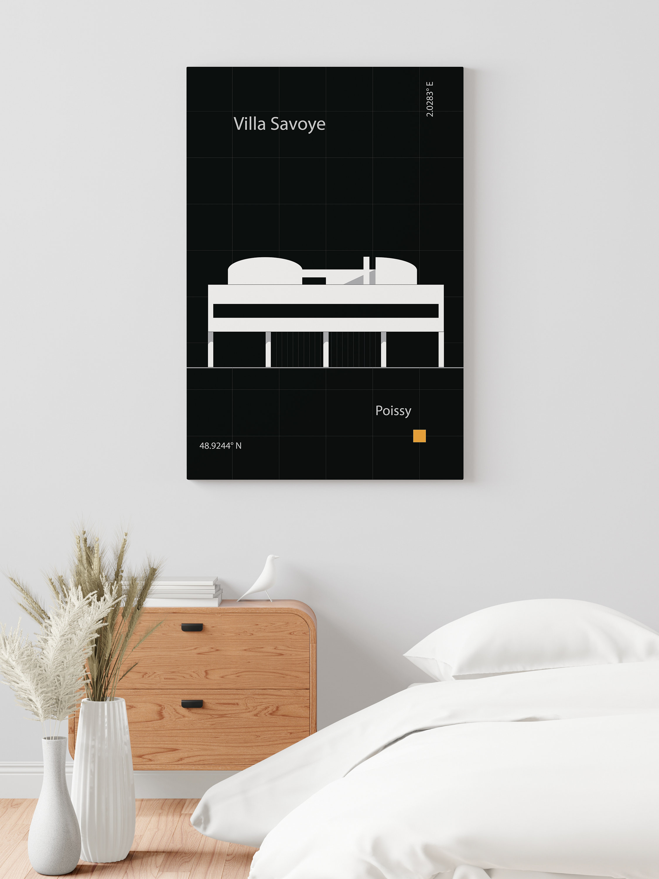 Experience the harmonious fusion of form and function as you explore the Villa Savoye's sleek exterior against a dark backdrop and clean lines. Each element of this iconic structure is carefully curated to evoke a sense of serenity and balance, making it the perfect focal point for any room.
