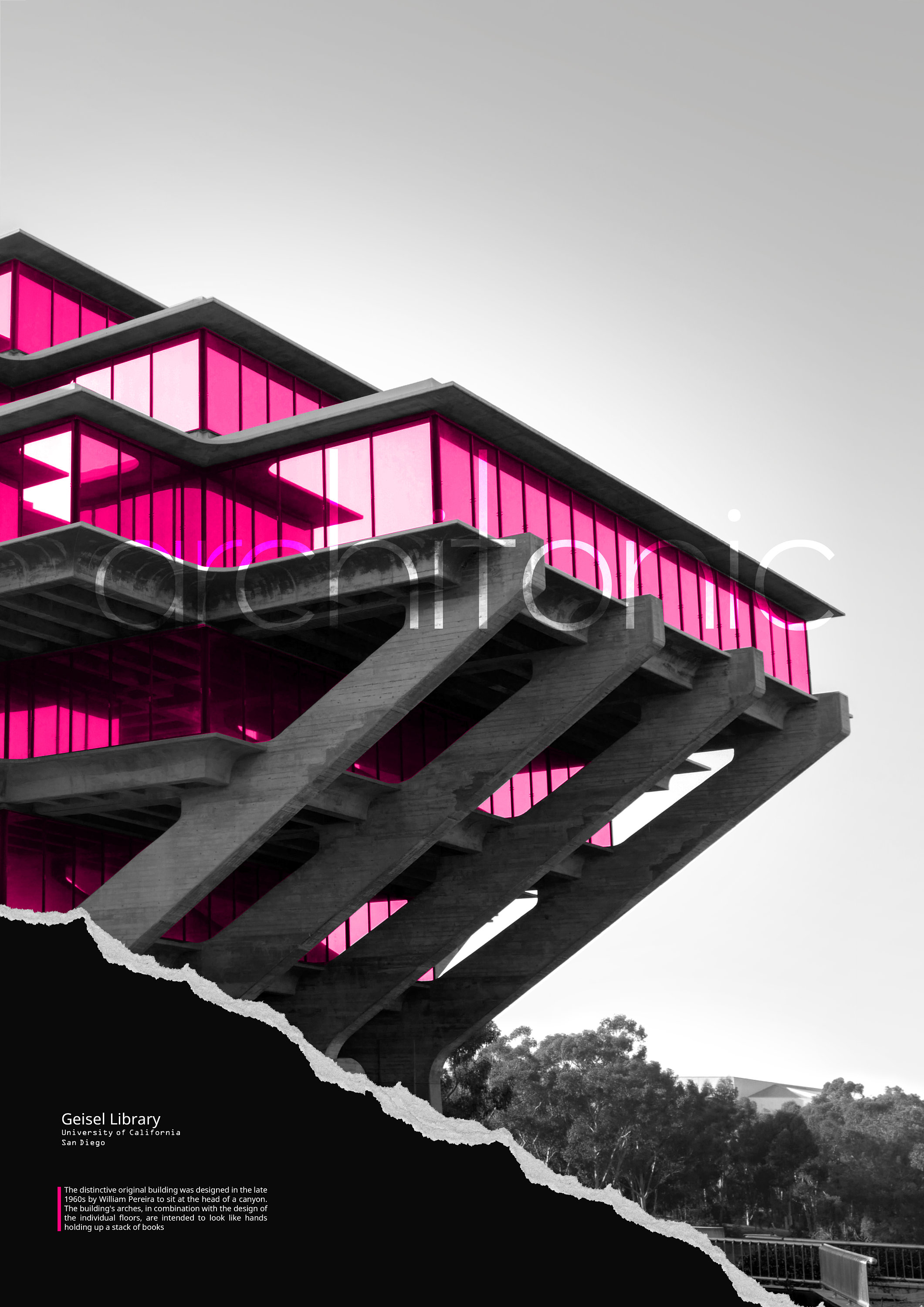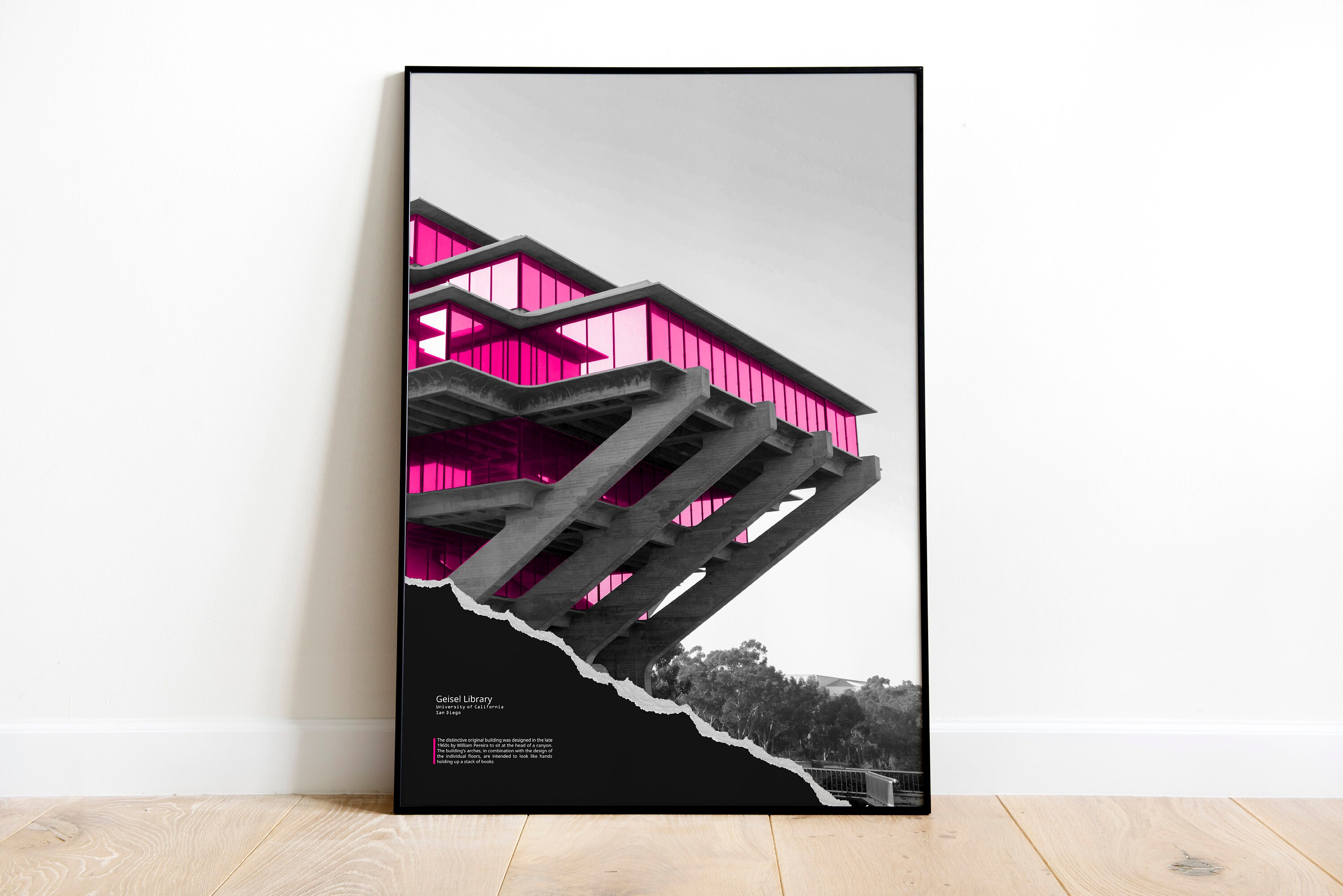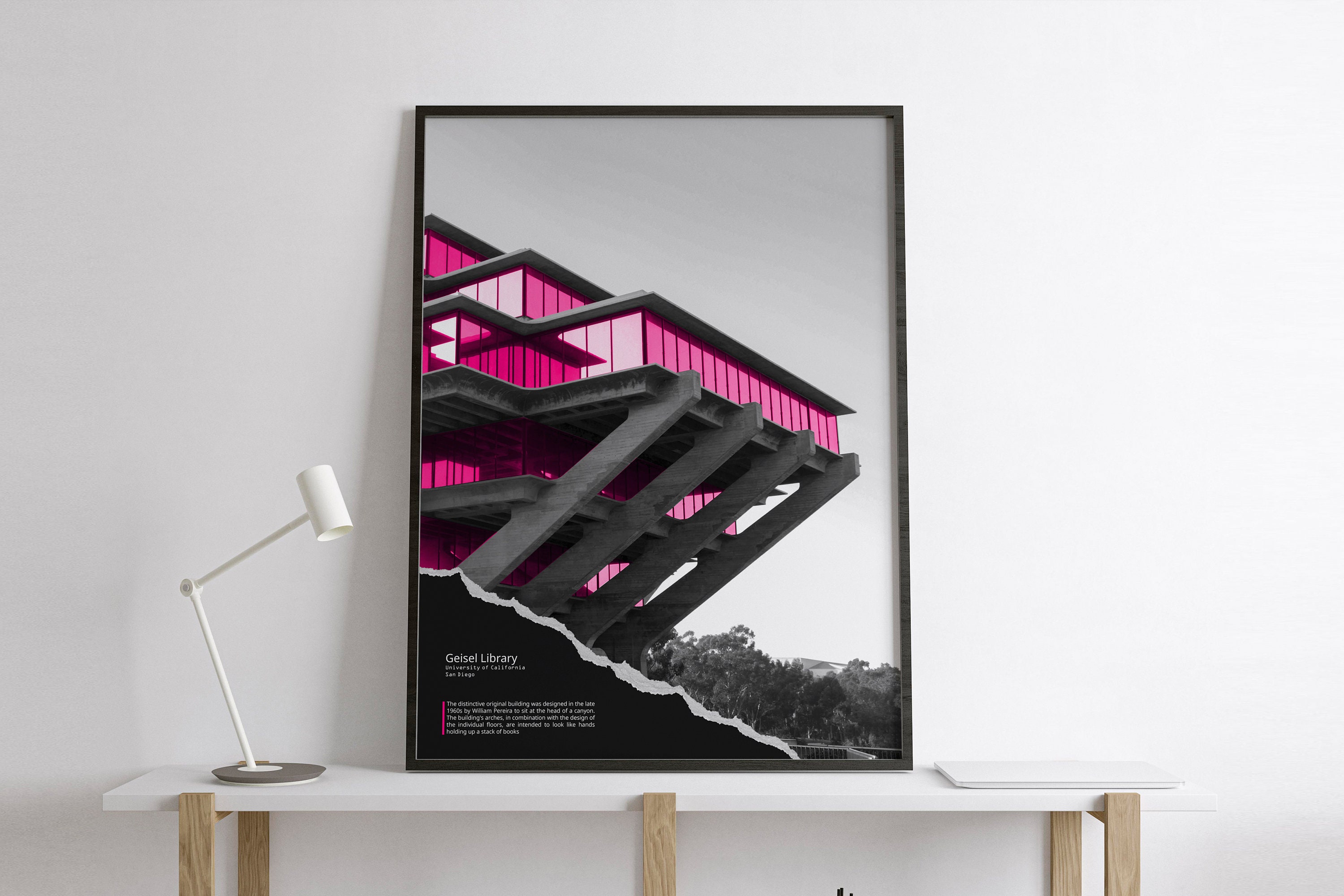 ★ Brutalist Poster - Geisel Library - Brutalist Architecture Wall Art. Black and white with magenta overlay.