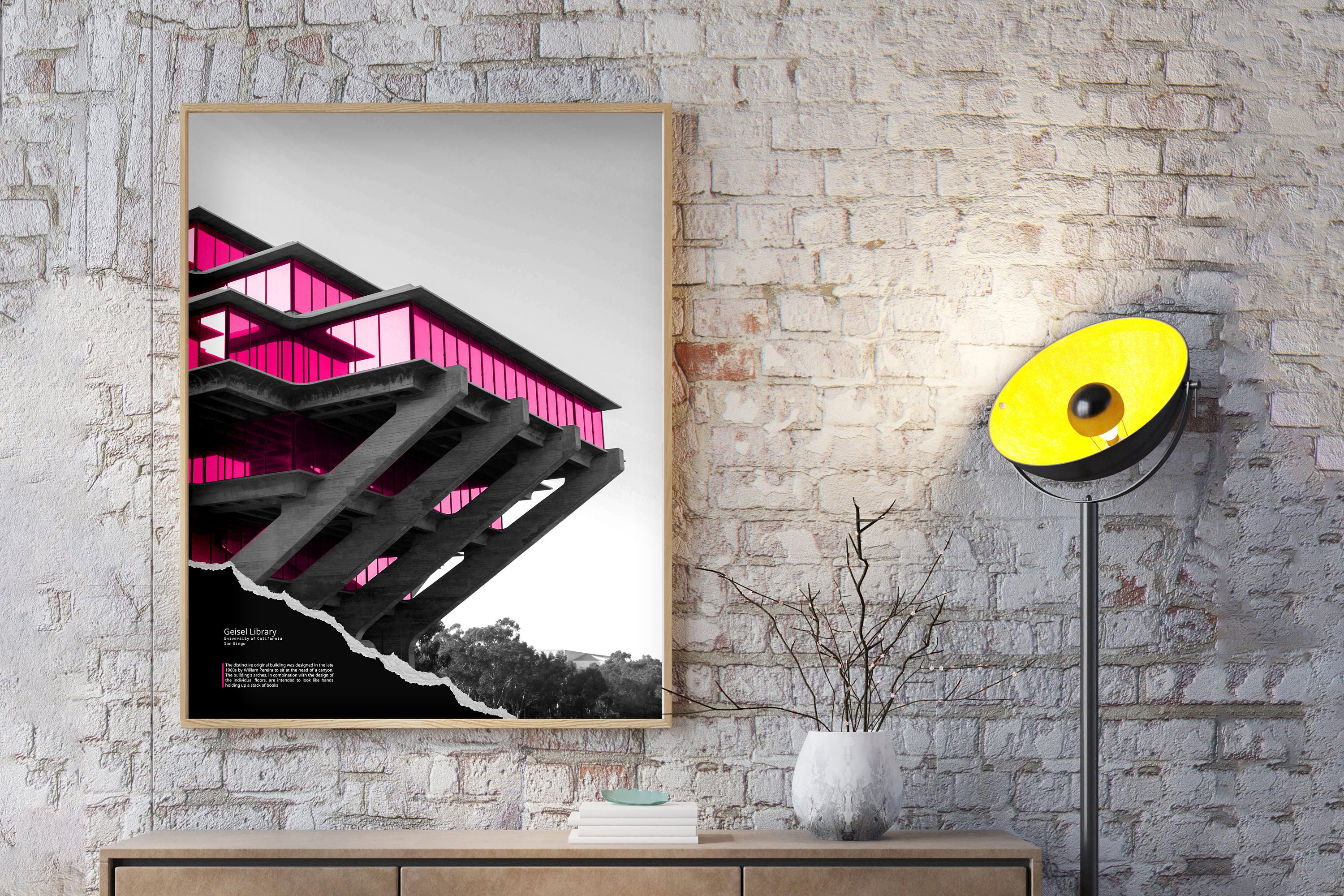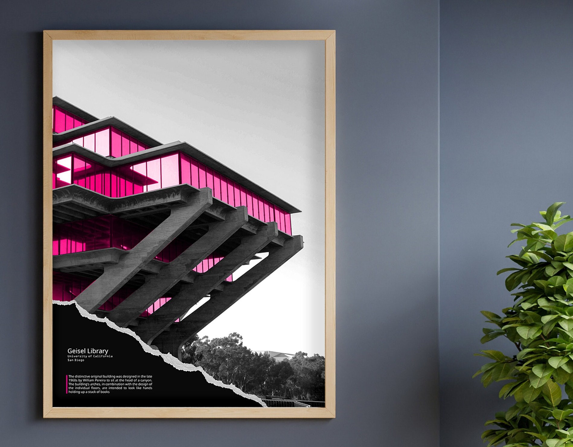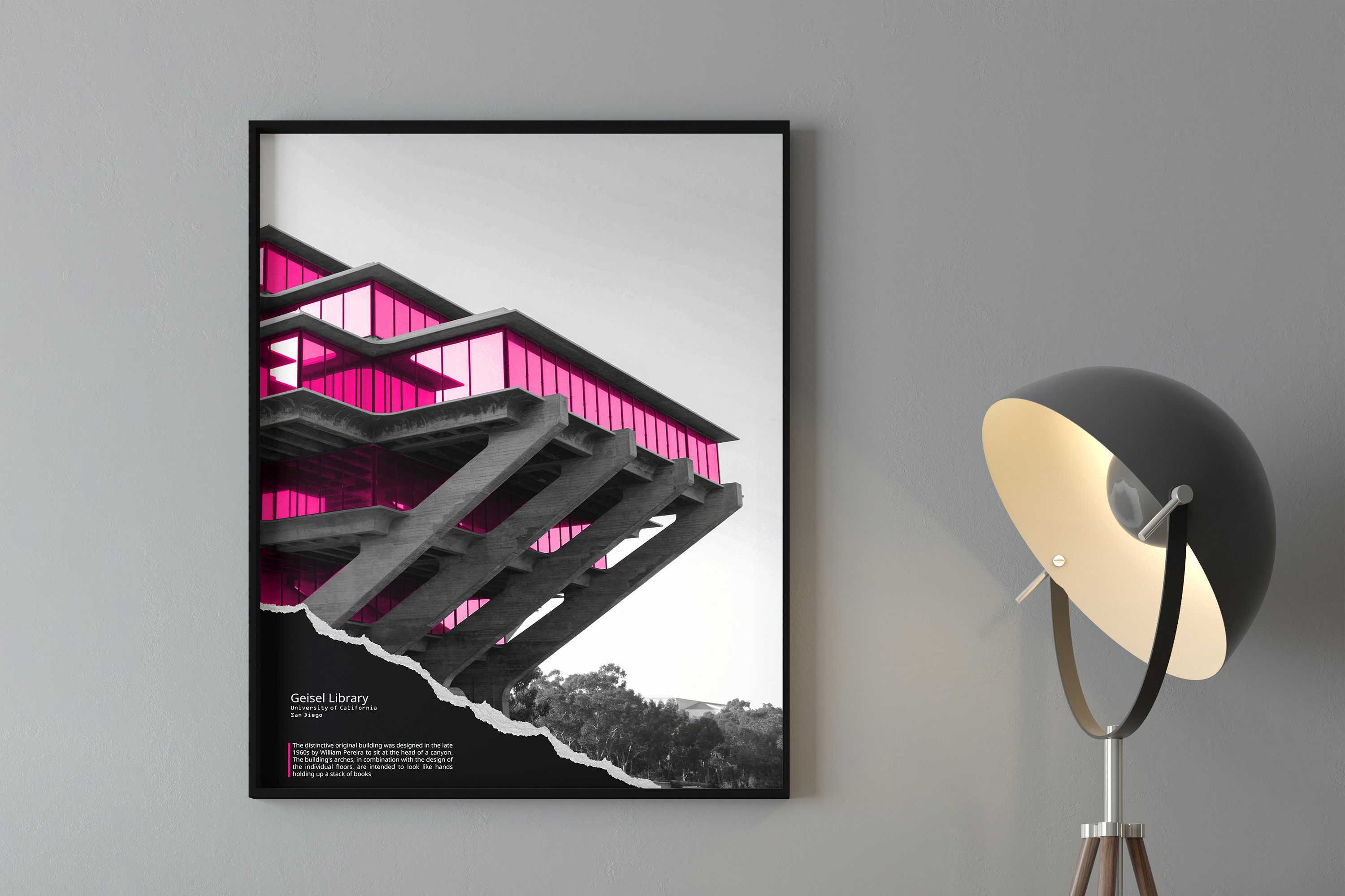 ★ Brutalist Poster - Geisel Library - Brutalist Architecture Wall Art. Black and white with magenta overlay.