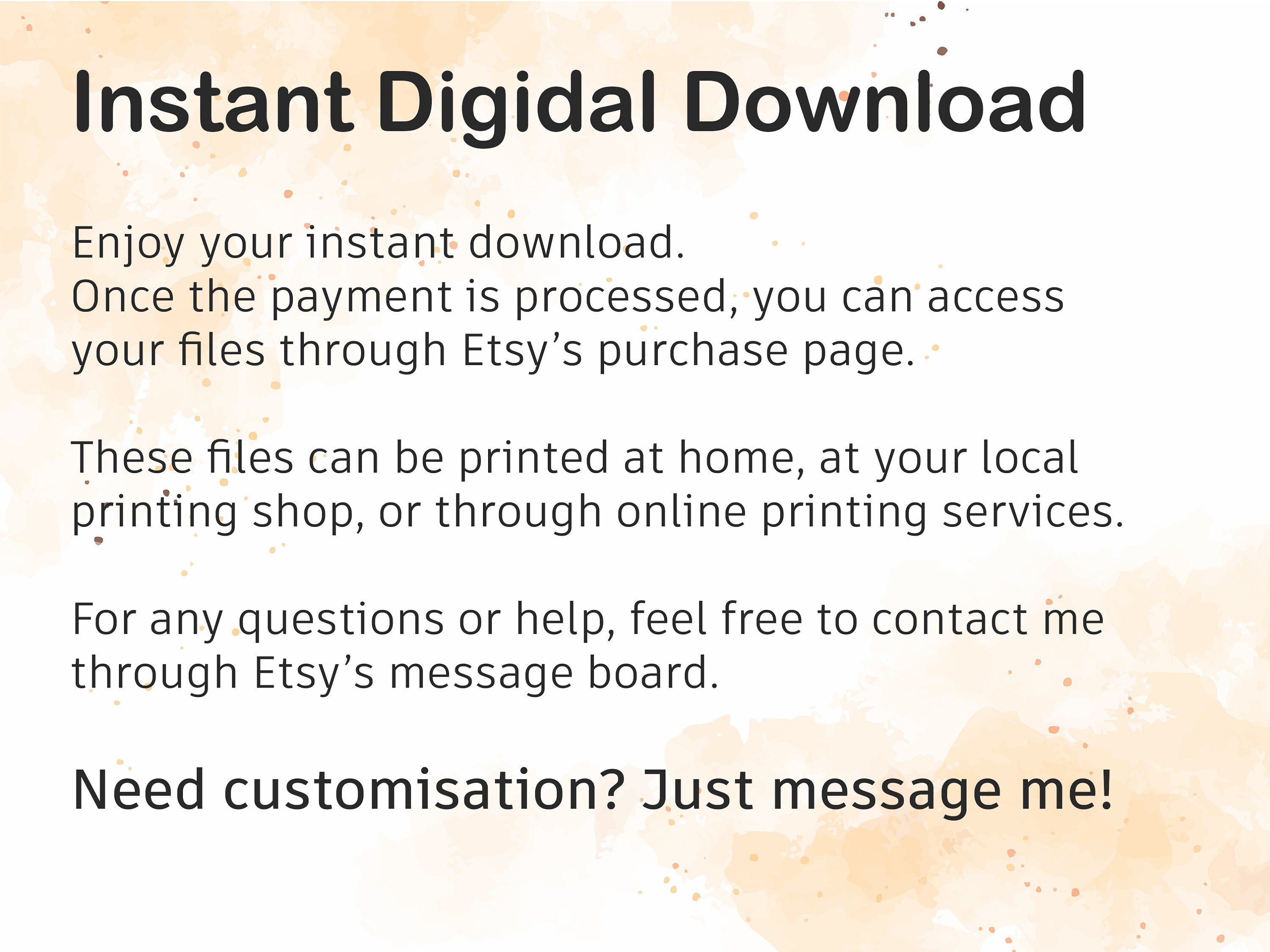 ★ After your payment has been verified, your files will become accessible for download. After purchasing a printed file on Etsy, you will be sent to a download page and sent a link through email. The Etsy purchases will always be accessible in the "Purchases" section of your account.