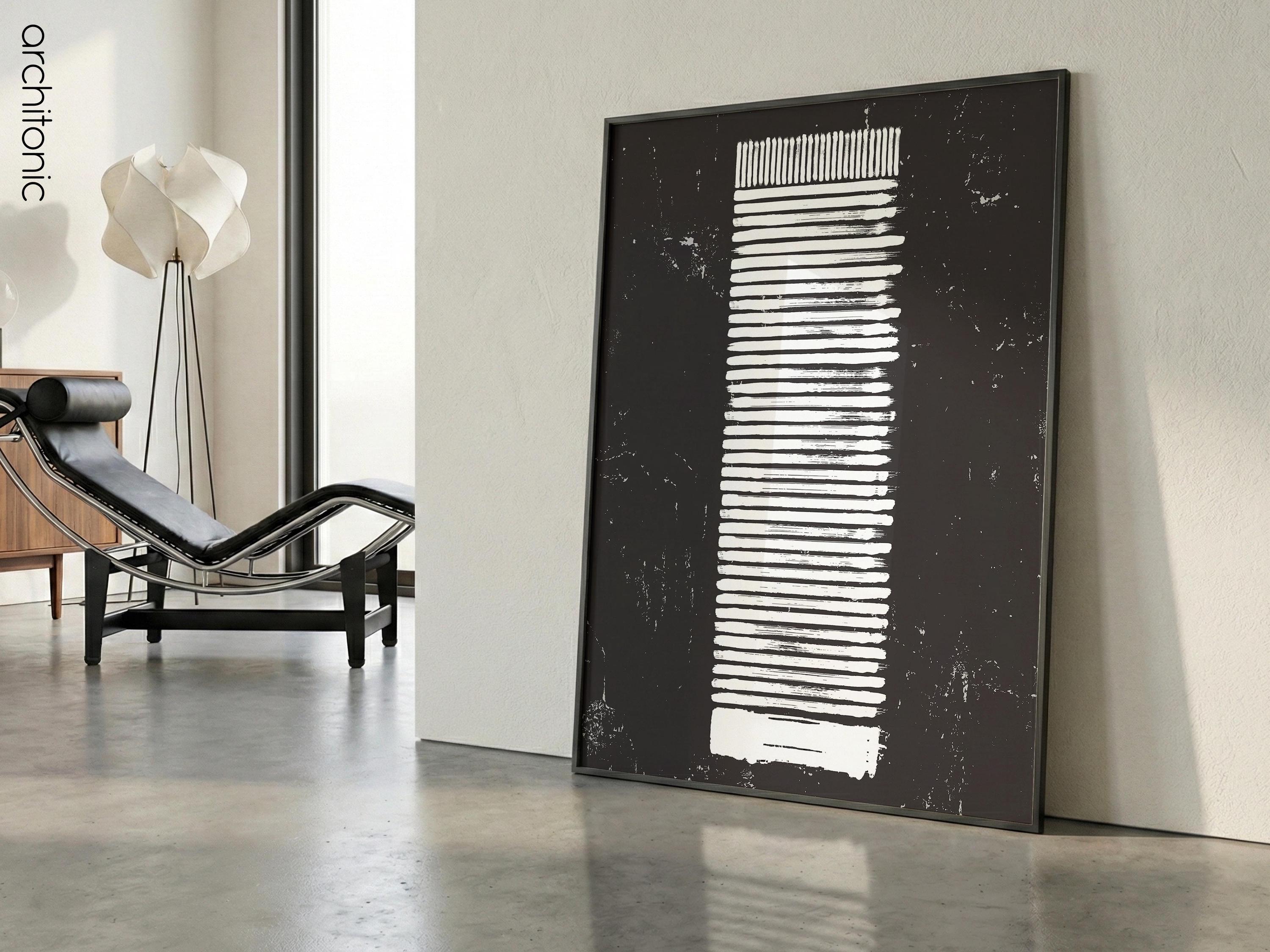 This digital print features an original abstract illustration inspired by the Seagram Building in New York City. Designed by Ludwig Mies van der Rohe, the building is a landmark of the International Style. This artwork translates its iconic bronze mullions and vertical rhythm into a minimalist, hand-sketched aesthetic.